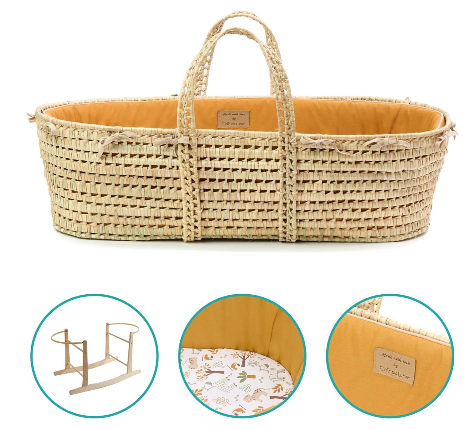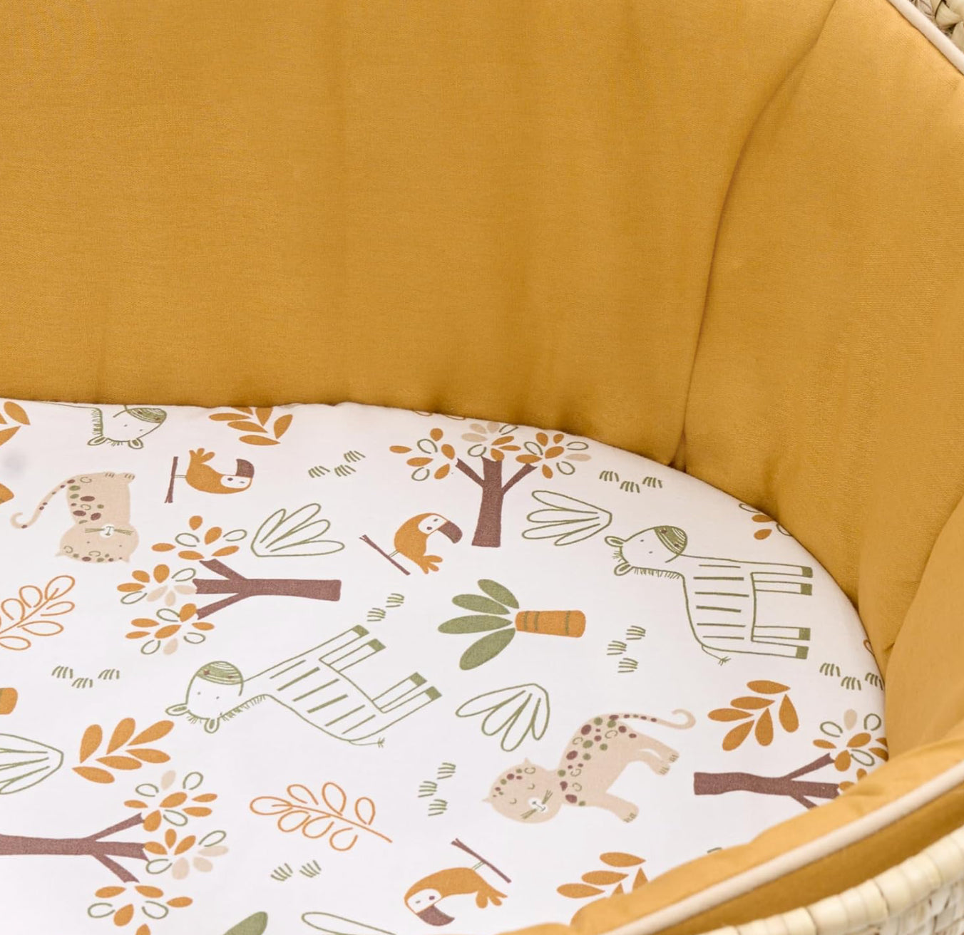 Crafted from handwoven organic palm leaves, the Savanah Palm Basket offers a traditional yet elegant sleep solution for your newborn. Its breathable design ensures airflow, enhancing your baby's comfort. This complete set includes ultra-soft cotton bedding adorned with safari animals, a hypo-allergenic water-resistant mattress, and a rocking stand, all designed for restful nights. Machine washable and thoughtfully designed for safe room-sharing, the Savanah Palm Basket combines quality materials with timeless craftsmanship to provide a secure and sophisticated sleeping environment.