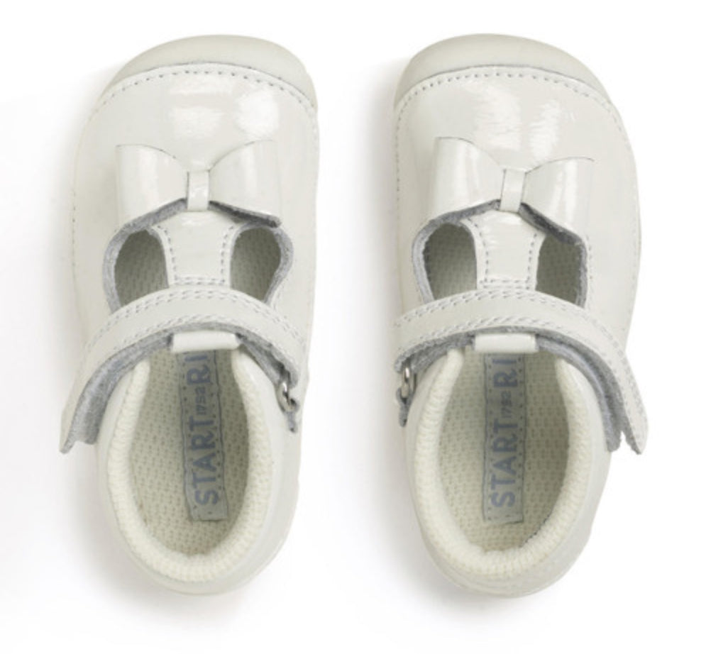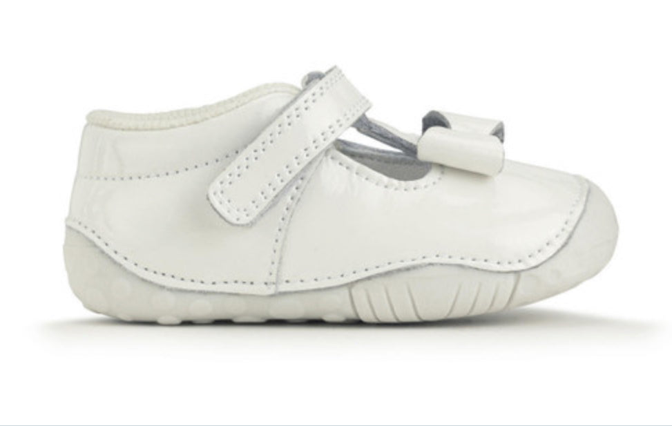 These elegant Start Rite Wiggle baby shoes feature a pristine white patent finish complemented by a delicate white bow. Designed to combine style with comfort, they provide a refined look perfect for special occasions or everyday wear. The smooth patent leather ensures easy cleaning, while the soft interior supports little feet with gentle care. A timeless choice for your baby's first steps.